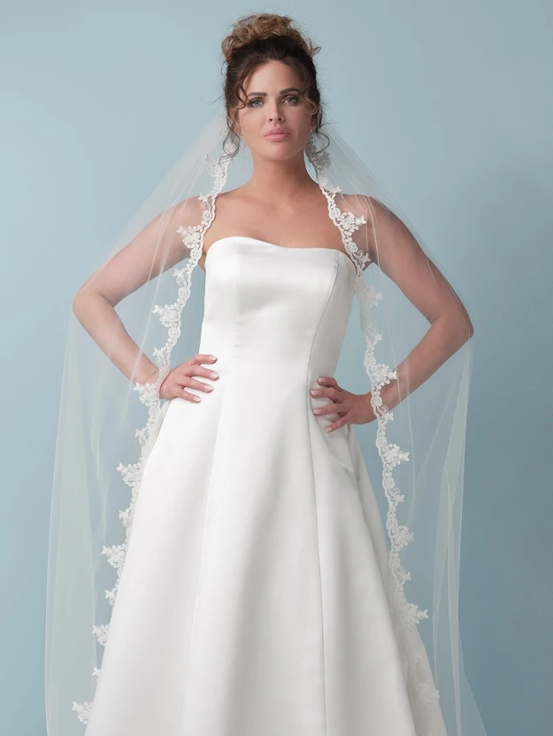 Deze prachtige sluier is vervaardigd van enkellaagse medium-tule en fijne kant, wat zorgt voor een luchtige en elegante uitstraling. Het bloemmotief, verfraaid met pareltjes en pailletjes, voegt een subtiele sprankeling toe aan je verschijning.