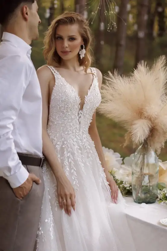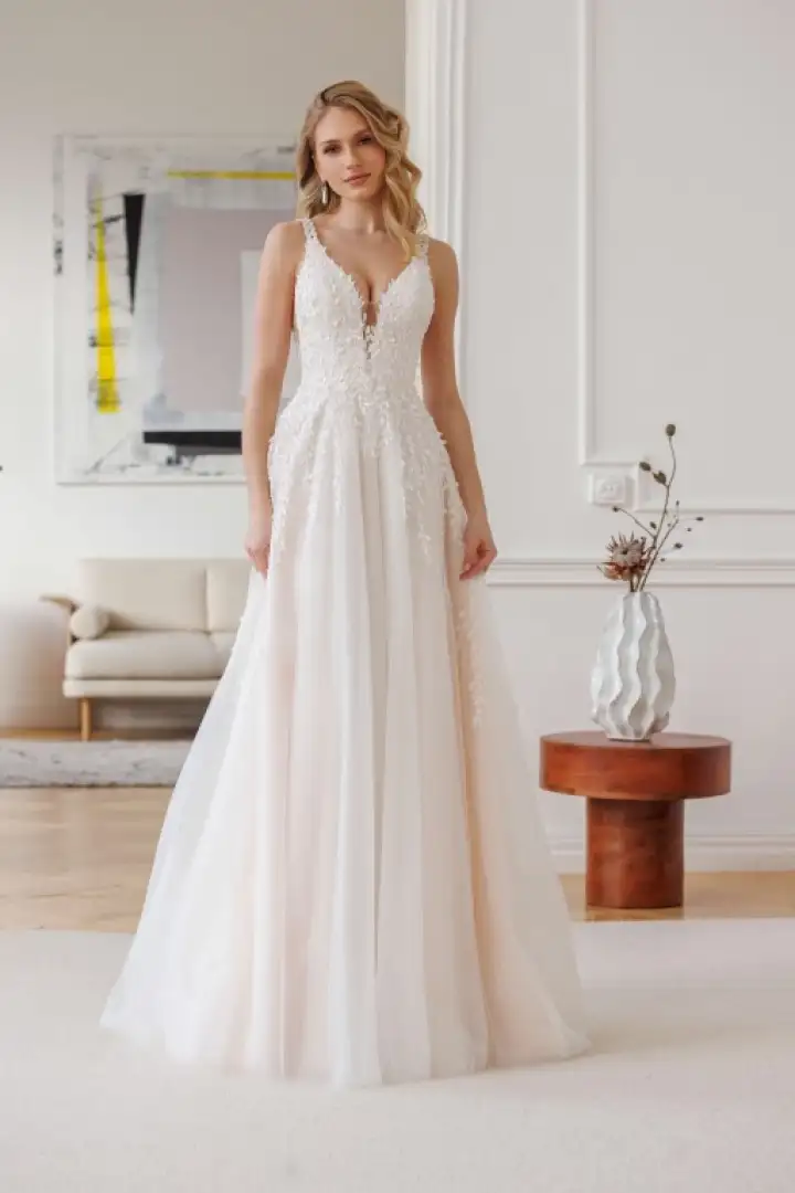 Het lijfje is rijkelijk versierd met fijne applicaties in de vorm van kleine blaadjes, die zorgvuldig zijn afgewerkt met kleine steentjes en schitteringen. Deze details zorgen voor die luxe, romantische look waar Jarice zo bekend om staat.