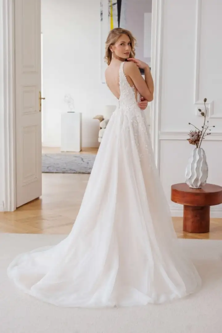 De A-lijn rok is gemaakt van meerdere lagen luchtige tule, waaronder een subtiele glitterlaag die elke beweging laat glinsteren. Deze fonkelende afwerking zorgt voor een magische, sprookjesachtige uitstraling die je gegarandeerd laat stralen tijdens jullie grote dag.