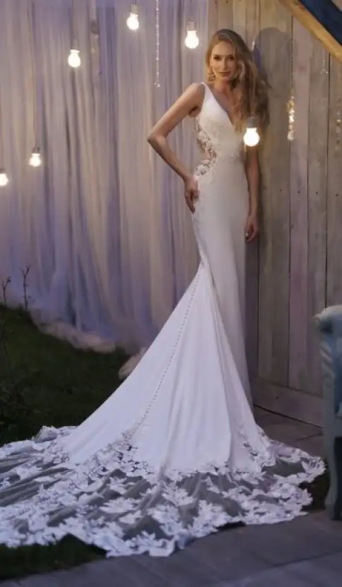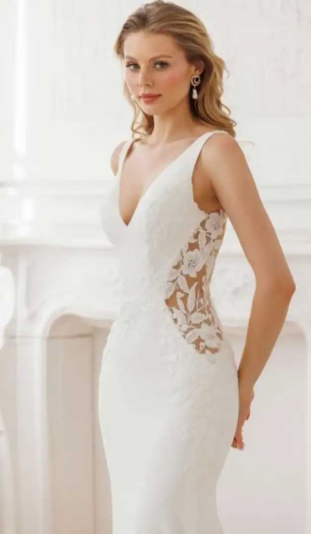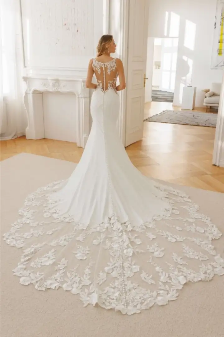 Een bijzonder detail aan deze bruidsjurk is de semi-transparante taille, die zorgt voor een subtiel sexy effect zonder overdreven bloot te geven. Deze illusie-accenten laten de jurk elegant op de huid aansluiten en geven een moderne, verfijnde uitstraling.
