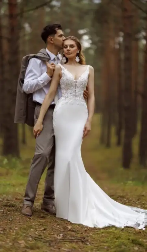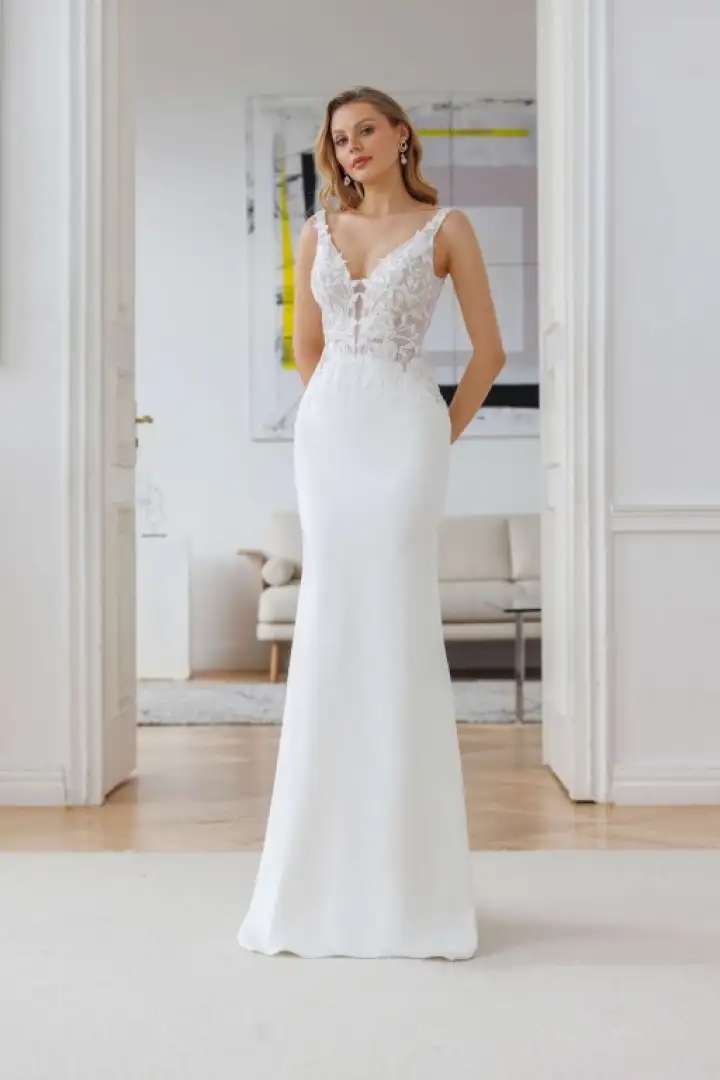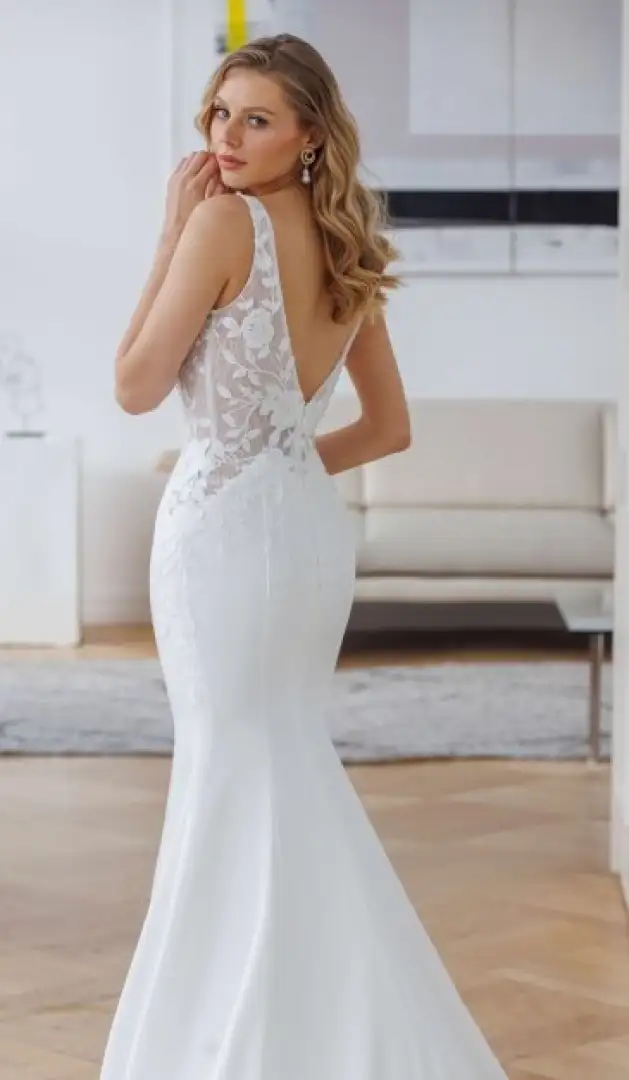 De jurk is slank gesneden over de heupen en loopt vanaf daar uit in een zachte, elegante sleep aan de achterkant. Hierdoor ontstaat een tijdloos silhouette dat je figuur prachtig omlijnt, terwijl je vrij kunt bewegen tijdens je grote dag.