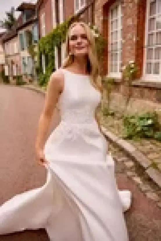 De jurk is vervaardigd uit micado stof, bekend om haar prachtige structuur en lichte glans. Deze stof geeft de jurk een luxe uitstraling zonder overdadig te zijn. Het bloemdetail in de taille voegt een romantisch accent toe, terwijl de hoge aangesloten halslijn zorgt voor een elegante, moderne look.