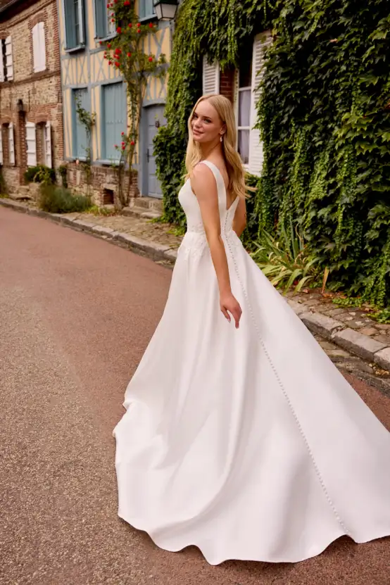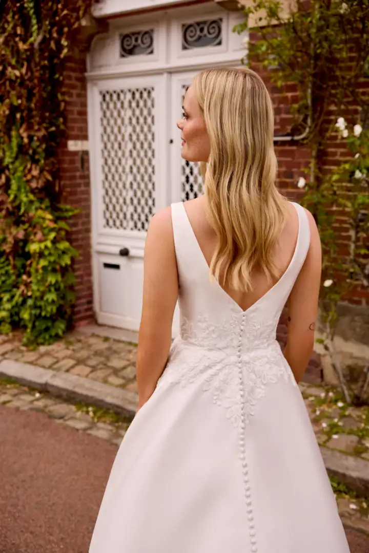 Aan de achterkant heeft deze bruidsjurk een diepe V-rug, afgewerkt met een rij satijnen knoopjes die doorlopen tot aan de rok. Dit detail zorgt voor een subtiel sensuele touch, zonder afbreuk te doen aan de klassieke uitstraling. Het maakt de Sweetheart 20025 een jurk die charme, verfijning en vrouwelijkheid perfect in balans brengt.